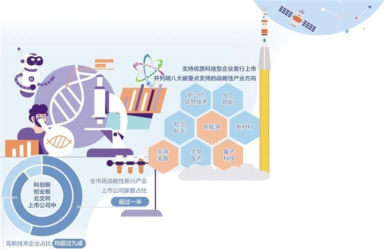 一批處于關(guān)鍵核心技術(shù)攻關(guān)領(lǐng)域的“硬科技”企業(yè)先后登陸A股市場,其中一些在上市后實(shí)現(xiàn)技術(shù)突破和跨越式發(fā)展,在集成電路、生物醫(yī)藥、高端裝備制造等領(lǐng)域形成產(chǎn)業(yè)集聚效應(yīng),有效促進(jìn)了資本、產(chǎn)業(yè)、技術(shù)、人才的深度融合。周小舟介紹,截至目前,科創(chuàng)板、創(chuàng)業(yè)板、北交所上市公司中高新技術(shù)企業(yè)占比均超過九成,全市場戰(zhàn)略性新興產(chǎn)業(yè)上市公司家數(shù)占比超過一半。